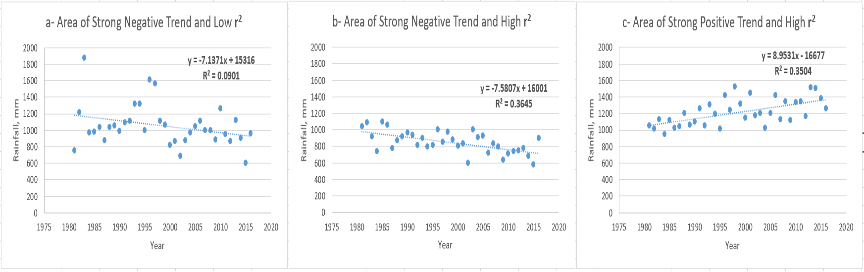 Based on Figure 4‑11 (1) and (2), site (a) has a 71mm decrease per decade (dark red) with r2= 9% (grey), site (b) shows a 75mm decrease per decade (dark red) with r2 = 36% (dark green), while site (c) shows 89mm increase per decade (dark green) with r2 = 35% (dark green). Sites (a) and (b) have similar trends, but the r2 values show that site (b) has the strongest correlation. Also, sites (b) and (c) have similar r2 shown as green color. Figure 4‑12 shows the regression plots of total annual rainfall against time for sites a, b, and c. The annual total for the period 1981–2016 was extracted using the Extract Statistics function in GeoCLIM, for each site, and plotted using Excel. The plots in Figure 4‑12 corroborate the difference in r2 by showing how close the points are to the regression line. Site (a) shows the points scattered, while sites (b) and (c) show the points closer to the regression line.