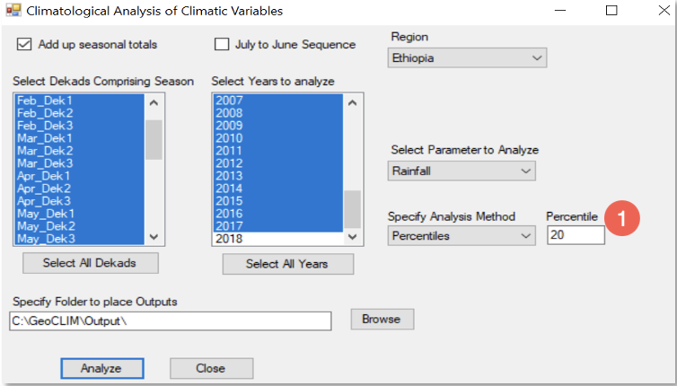 Select the periods comprising a season of interest on the left panel. The data period (pentads, dekads, or months) is based on the selected climate dataset. In this case, the data period is 10 days totals (dekads) (Figure 4‑2 (7)).