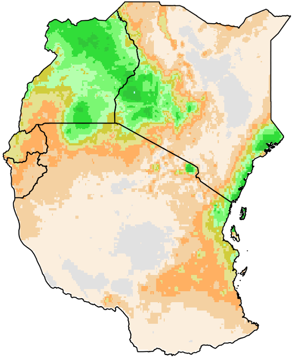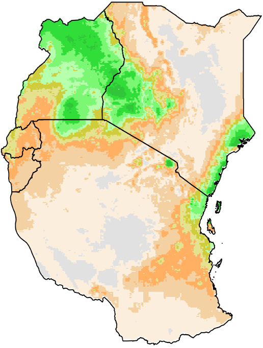 The resulting map shows, in tones of yellow to dark-brown, the areas that received below the median rainfall during the period of analysis. Colors light-blue to red indicate above median rainfall. See Figure 4-18.