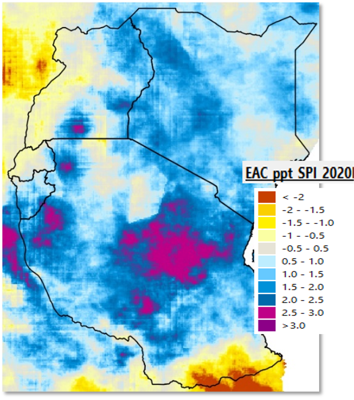 Figure 4-18 SPI Feb-May 2020 (CHIRPS 1981-2020). The GeoCLIM SPI raster output is in units of [SPI * 100], but the legend shows actual SPI values.