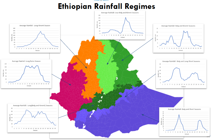 Example: Below is a characterization of Ethiopia's rainy seasons. Each color represents a set of polygons sharing similar rainfall patterns. The large areas are made by classifying level3 administrative units (municipalities).