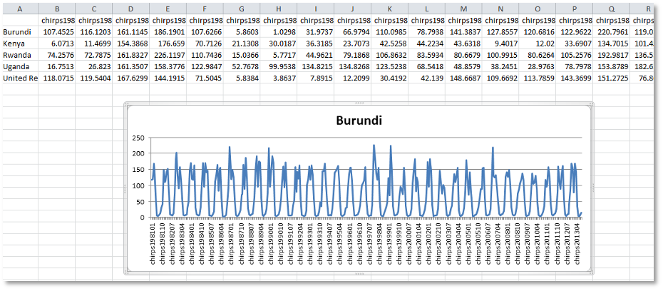 La herramienta Extract Grid Statistics de cuadrícula produce un archivo de tabla CSV con filas correspondientes a los polígonos del archivo de forma de entrada. Las columnas contienen el valor resumido de cada archivo ráster seleccionado. La Figura 10-3 muestra la tabla CSV de salida en Excel para la precipitación promediada espacialmente utilizando decadias CHIRPS para cada uno de los países de la región EAC. Para realizar análisis adicionales de los resultados, como la producción de gráficos de series de tiempo, abra el archivo CSV en Microsoft Excel (u otro programa de hoja de cálculo).