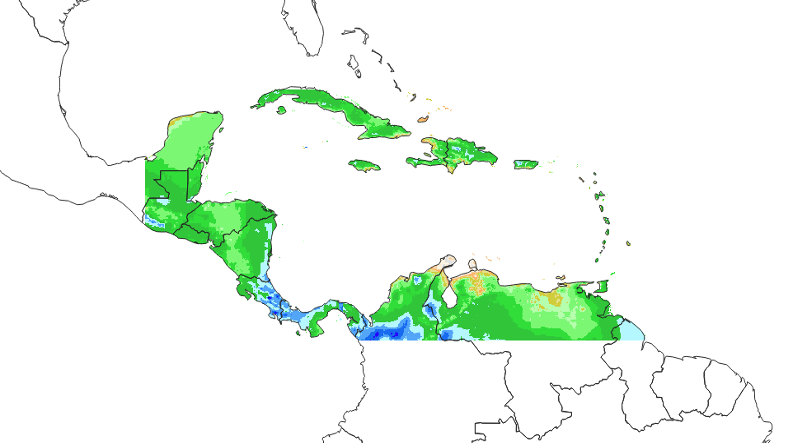 Ahora estás listo para trabajar con las funciones de GeoCLIM. Consulta la Figura 2-10 para ver un ejemplo de un formulario completado y la Figura 2-11 para ver un ejemplo del resultado (promedio de precipitaciones) utilizando esta región. La imagen muestra la región de América Central y el Caribe (lat/lon), y el resultado del análisis está limitado por la máscara.