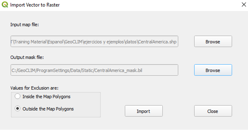 X:\fews_tools_WS\ProgramSettings\Data\Staticpara seleccionar el archivo de máscara. Si no tienes un archivo de máscara, puedes crear uno en este punto. Las máscaras son imágenes raster que se utilizan para incluir solo el área de interés deseada en el análisis e ignorar las áreas circundantes. Una máscara es un conjunto de datos raster con un valor de píxel de "1" para el área de interés y "0" para fuera de ella. La máscara facilita la ejecución de los algoritmos en las áreas donde el valor del píxel es igual a 1, mientras excluye las áreas donde los valores de píxel son igual a 0. Puedes crear una máscara utilizando un shapefile del área de interés (por ejemplo, unidad administrativa, cuenca hidrográfica, etc.) siguiendo los pasos a continuación:En el formulario de definición de la región, haz clic en el botón Import Mask from Vector.