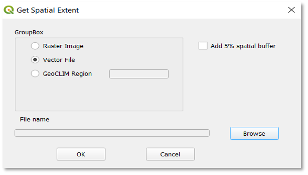 Extrayendo las coordenadas de un mapa existente de la siguiente manera: Haz clic en Get Extent from Map y selecciona una de las opciones geográficas ofrecidas por defecto. En nuestro ejemplo, seleccionamos el archivo shapefile para la región de interés. La herramienta recupera automáticamente las coordenadas, consulta la figura 2-7.