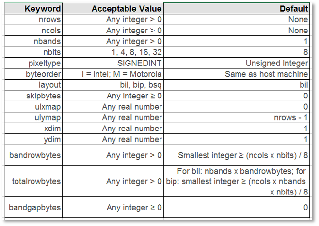 NOTA: De forma predeterminada, el tipo de píxel del conjunto de datos BIL utilizado son enteros sin signo, a menos que se utilice la palabra clave "pixeltype" en el archivo HDR y su valor sea "signedint."