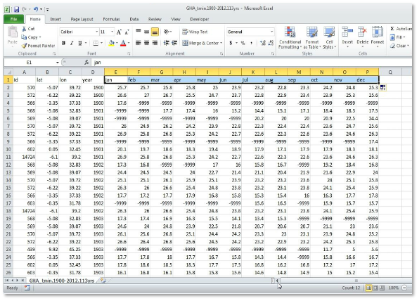 El programa GeoCLIM utiliza tablas en formato delimitado por comas (*.csv) como datos de entrada y salida. Por ejemplo, las tablas son entradas en el proceso de combinar datos ráster con valores de estación (BASIICS) o validar datos ráster. Para el proceso de combinación, la tabla CSV debe tener columnas para ID, latitud (lat), longitud (long), año y período de tiempo (pentadas, decadias o meses), como los meses de enero a diciembre en la Figura 3. 4. Las columnas ID, latitud, longitud y año no tienen que estar en ningún orden y se permiten columnas adicionales. Sin embargo, las columnas de períodos de tiempo deben ser consecutivas (Figura 3-4).