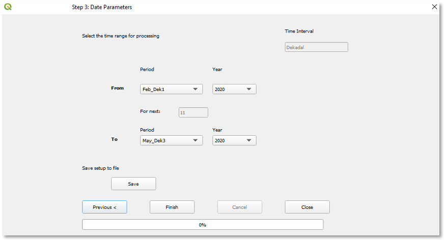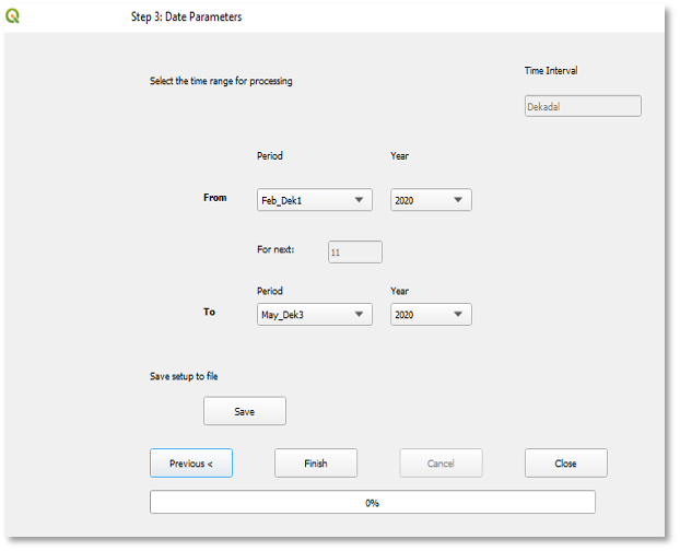 Seleccione el rango de tiempo From y To de los datos para combinar. El período de tiempo y el intervalo de tiempo se basan en la definición del conjunto de datos climáticos seleccionado. En este ejemplo estamos usando decadias, consulte la figura 9-17. Y estamos mezclando desde febrero (decadia 01) hasta mayo (decadia 03) de 2020.