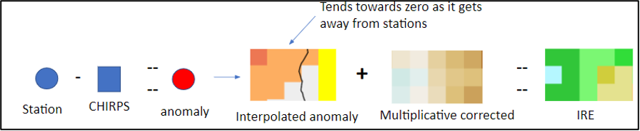 Paso 4. Las anomalías interpoladas se agregan a la capa de lluvia corregida multiplicativa del paso 2 para obtener la Estimación de lluvia mejorada (Improved Rainfall Estimate, IRE, en ingles), ver Figura 9-8.