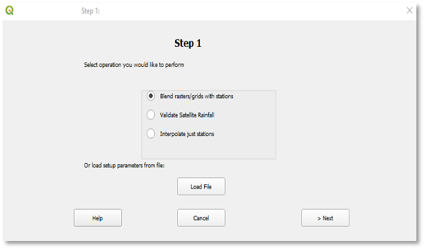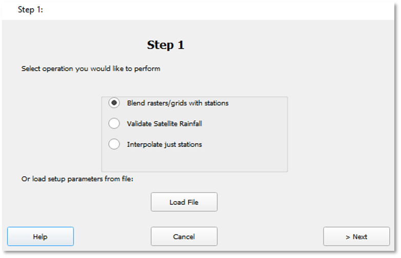 Seleccione la opción ■ Blend rasters/grids with stations. En este punto, puede hacer clic en el botón Load File para cargar la configuración previamente guardada o hacer clic en el botón > Next para iniciar un nuevo proceso de fusión. Consulte la Figura 9-9.