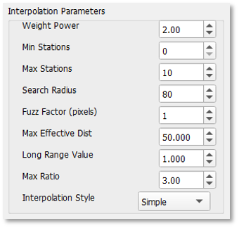 Max Effective Distance (MAXEFFECTIVEDIST): Este parámetro es la distancia máxima sobre la que tiene influencia una estación. Este parámetro solo funciona con el estilo de interpolación simple (idw_s, consulte la sección de estilo de interpolación a continuación). Es muy importante considerar las características locales de la región para elegir un valor adecuado para este parámetro. Le recomendamos probar diferentes combinaciones de valores para la distancia máxima efectiva y el radio de búsqueda para evitar el efecto localizado (ojo de buey) alrededor de la ubicación de la estación.