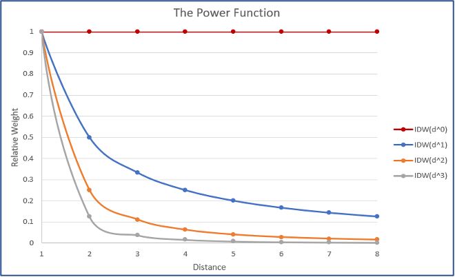 Weight Power (WEIGHTPOWER): La potencia a la que se eleva la distancia inversa al calcular el peso, indica qué tan rápido disminuye la influencia de la estación a medida que aumenta la distancia desde el punto. La Figura 9-13 muestra un ejemplo de IDW con diferentes potencias.