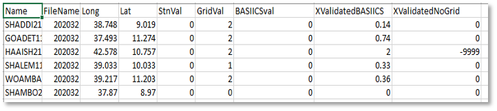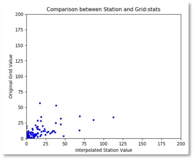 Un archivo CSV con columnas que contienen los metadatos para cada estación junto con el valor de la estación, el valor del píxel correspondiente y el valor interpolado en el punto donde está la estación. Estos valores interpolados se producen para mejorar la comparabilidad entre los datos en raster y los datos de las estaciones. El archivo CSV incluye estadísticas que muestran la correlación entre el campo de precipitación y los datos de las estaciones (Figura 9-6c).