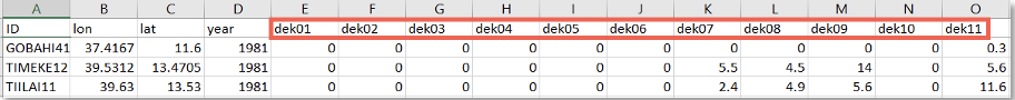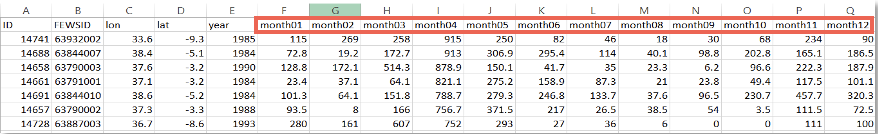 Figura 9-4 La tabla CSV con los datos de las estaciones debe contener un ID de estación, longitud, latitud, año y una columna para cada pentada, decadia o mes.