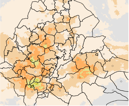 El intervalo de tiempo (por ejemplo, mes, decadia o pentadas) del conjunto de datos raster seleccionado se muestra automáticamente. Selecciona el rango de tiempo "Desde" y "Hasta" de los datos raster a validar. El período de tiempo y el intervalo de tiempo se basan en la definición del conjunto de datos climáticos seleccionado (ver capítulo 2 para cómo definir un conjunto de datos). En este ejemplo estamos utilizando decadias, consulta la Figura 9-5. Estamos validando desde (Feb decadia 01) hasta (mayo decadia 03), 2020.