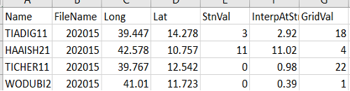 Figura 9-11 La tabla CSV con datos de la estación debe contener un ID de estación, longitud, latitud, año y una columna para cada pentada, decadia o mes.