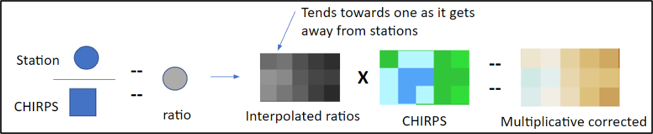 Figura 9-7 La primera parte del proceso de fusión es una corrección multiplicativa basada en la relación entre la estación y los valores ráster.