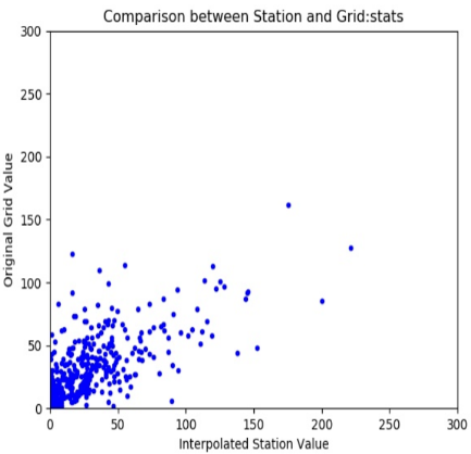 El proceso de validación primero extrae valores de un raster en todas las ubicaciones donde los datos de puntos tienen valores válidos (es decir, valores no faltantes. Los valores faltantes pueden especificarse en las entradas). Los resultados del proceso de validación son: 1) Un shapefile con los puntos que fueron incluidos en el proceso. 2) Un campo raster de los valores interpolados. 3) Una tabla .csv que contiene los valores de las estaciones, el valor del pixel correspondiente junto con información sobre la regresión de mínimos cuadrados entre el valor de los datos observados/in situ en los puntos evaluados y los valores raster extraídos, junto con un valor de R-cuadrado de salida. Una vez que se ha determinado la correlación, entonces los datos raster y de las estaciones pueden mezclarse para producir un conjunto de datos mejorado.