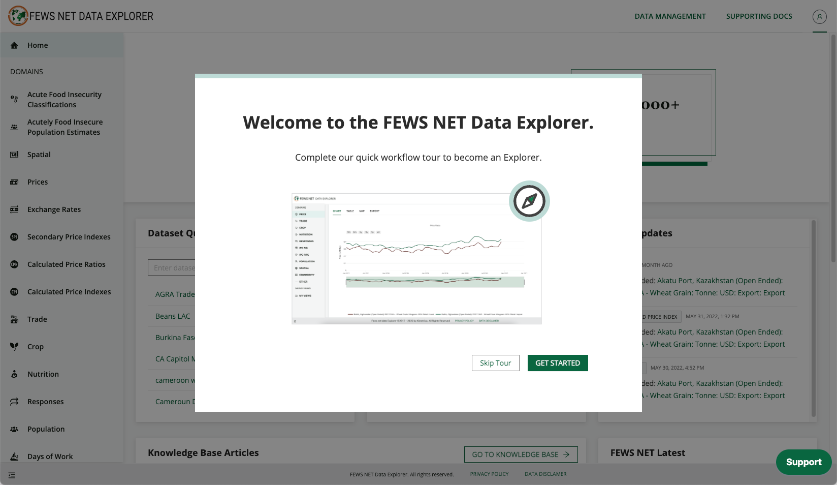 As part of the latest updates to the FEWS NET Data Explorer (FDE), new users will automatically be invited to learn about the platform through the quick workflow tour. Plus, you can now view large numbers of results directly from the data series table. We’ve also laid the groundwork for exciting new features that will customize your experience. Read on to learn more.